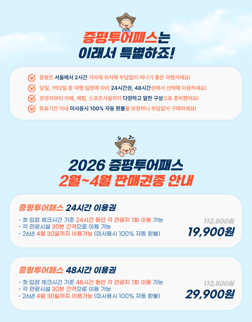 • 증평투어패스 구매 바우처를 제시하면 할인 혜택을 받을 수 있습니다.